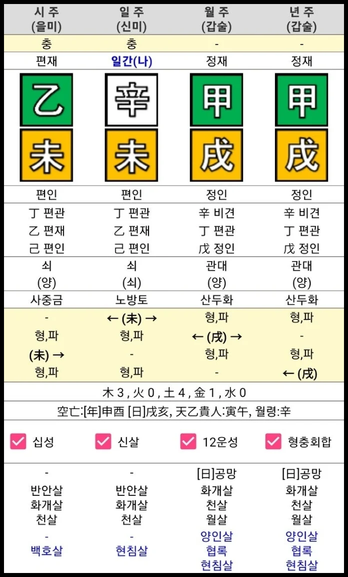 이 사주는 일간이 신금이고, 월주와 년주에 갑술이 반복되어 있습니다. 시주에는 을미, 일지에도 미토가 들어와 있어서 전체적으로 토 기운이 아주 강하게 자리한 모습입니다. 여기에 위쪽 천간으로는 갑목, 갑목, 을목이 드러나 있어 재성도 눈에 잘 띕니다.