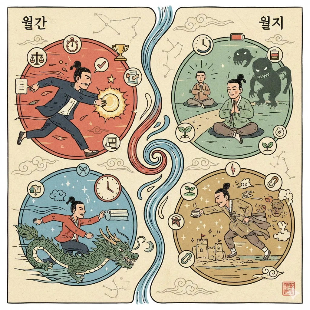월간이 추진형인데 월지가 루틴형이면, 시작은 빠르지만 중간부터 속도 조절을 해야 성과가 유지되는 사람으로 읽힙니다. 반대로 월간이 신중형인데 월지가 급한 패턴이면, 평소엔 차분하지만 마감이나 압박이 들어오면 갑자기 몰아치는 흐름으로 나타날 수 있습니다. 이런 식으로 월간이 보여주는 겉의 방식이 월지에서 반복 습관으로 굳어지는지, 아니면 부딪혀서 소모가 생기는지가 핵심 포인트가 됩니다.